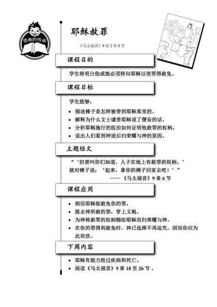 每课以一页概览开始,内容包括课程目的、课程目标/主要真理、主题经文以及课程应用。你可以用来指导一周的学习和备课。“课概览”部分旨在帮助你评估学生的学习内容。这一页是整节课的大纲。我们有意识地加入了比一般课程更多的目的/主要真理。随着时间的推移,您就能衡量出学生能消化多少内容。