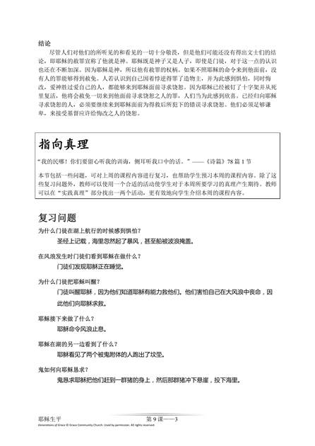 在初次读完圣经故事后,课文中的“引导问题”多半适合该阶段的儿童。这些问题不单是为温习故事的主要内容和事件,也是为了引导学生从经文中发现有关神、罪、人和福音的真理。教师可利用这些问题了解学生对经文的掌握程度,弥补他们可能存在的想法方面的缺欠。