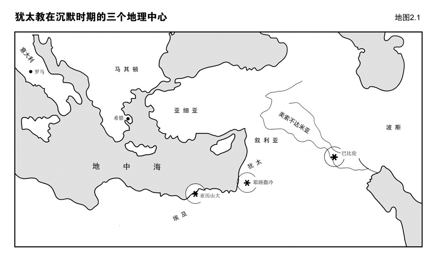 在那几个沉默的世纪里,犹太教在巴比伦、亚历山大和耶路撒冷三大中心的发展最为鼎盛。请观察地图2.1中这三个城市的地理位置。