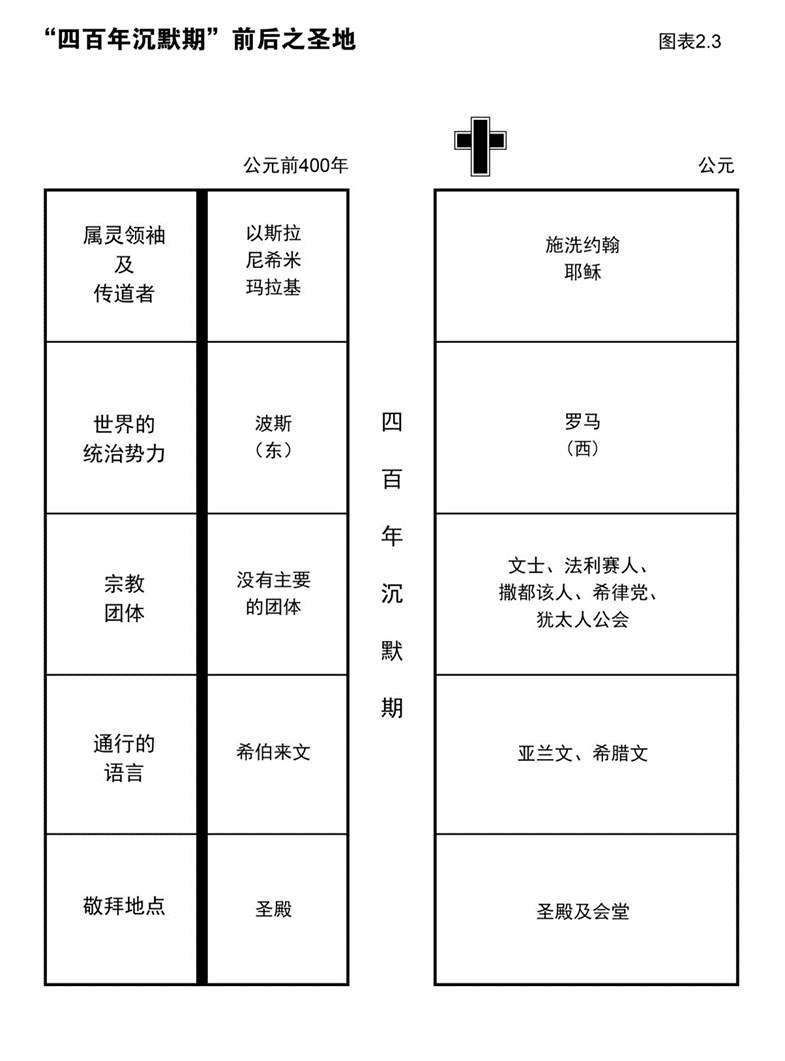 在这四百年里,犹太教的背景有着很大的改变,例如可以比较一下旧约圣经终结和新约圣经开始时的情况。旧约圣经记载的最后一个历史事件,就是被掳的犹太人在以斯拉和尼希米率领下从巴比伦归回耶路撒冷。[4]新约圣经的开首,便记载了耶稣基督的降生。下图列述了这四百年间的一些转变。
