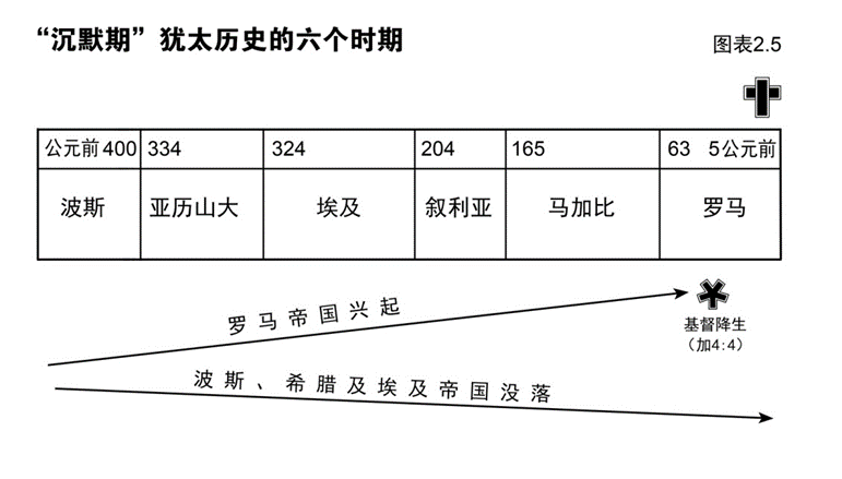② 犹太历史(国际政治)的六个时期:新旧两约之间是以色列史上的一个黑暗时期,犹太人的生活和命运完全仰赖当时大国的鼻息。正如地图2.1所示,犹太处于各国的中央,自然是强国虎视眈眈的猎物。两约之间的历史可分为六个时期,而各时期均以当时的强国命名。[10]请参阅图表2.5。