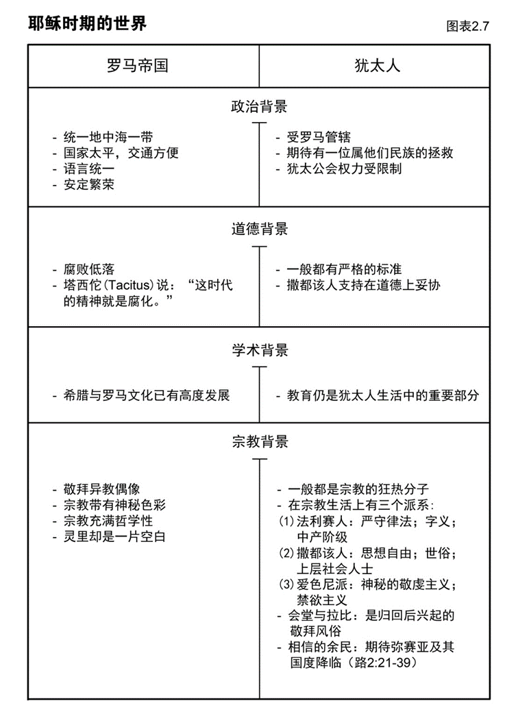 一般说来,罗马政府甚少干预巴勒斯坦的宗教生活,犹太人只是向罗马政府缴税,并接受政府所委派的统治者管治。当时犹太人面对的难处,主要是内心的矛盾和挣扎,以及社会上的黑暗和罪恶。斯托克(James Stalker)对于耶稣将要降生其中的犹太民族,有以下的描述: