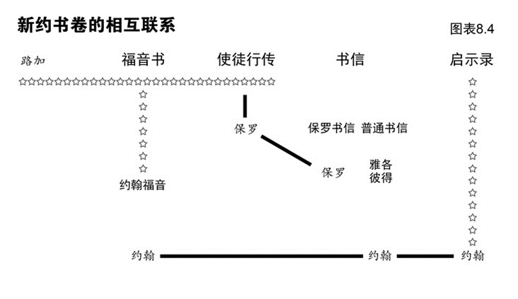 我们已经知道约翰是约翰福音、约翰书信及启示录的作者。图表8.4亦显示约翰福音把新约圣经的三类著作(历史、书信和异象)连接起来。请注意图表8.4中有关整本新约正典的其他连锁关系。