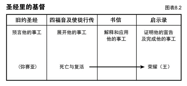 图表8.2表明新约圣经的三类体裁,以及旧约圣经如何记载基督的传道工作。