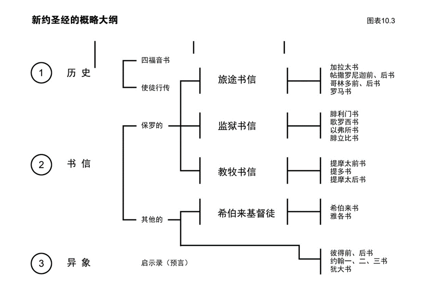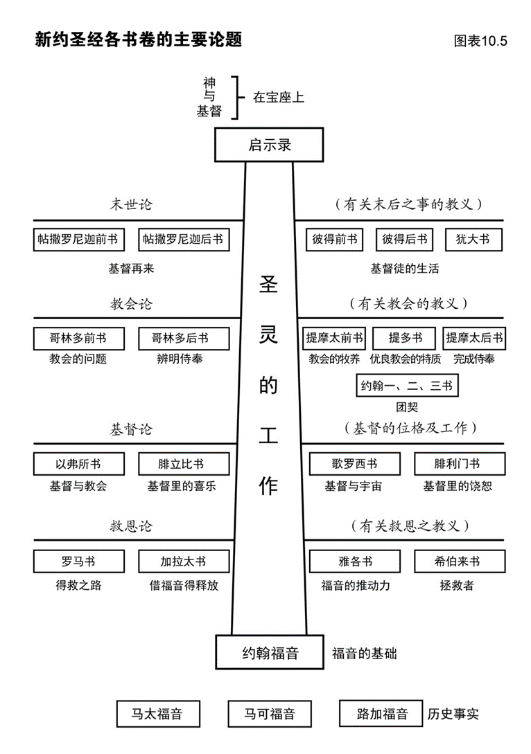 循这门径亦有不同的次序,以下是其中一个建议(参图表10.5)。图表10.5是结合逻辑次序(从马太福音至启示录,中栏是使徒行传,保罗书信并列两旁)和教义的发展(救恩、基督、教会、末世)。
