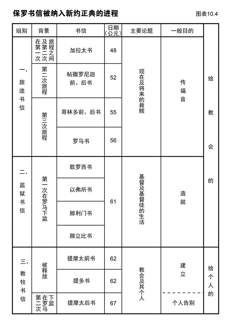 保罗书信在新约中并非按成书的先后次序排列的。细心研读图表10.4,留意新约正典循序渐进的增加过程。你可有发现三个组别的主题是如何演进的?