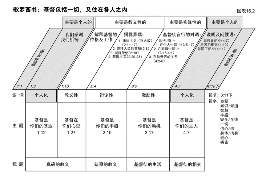 图表16.2是歌罗西书的综览图表,当你概略地阅读过之后,请依从下列提供的研习建议。