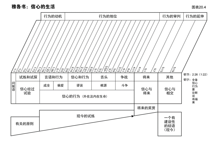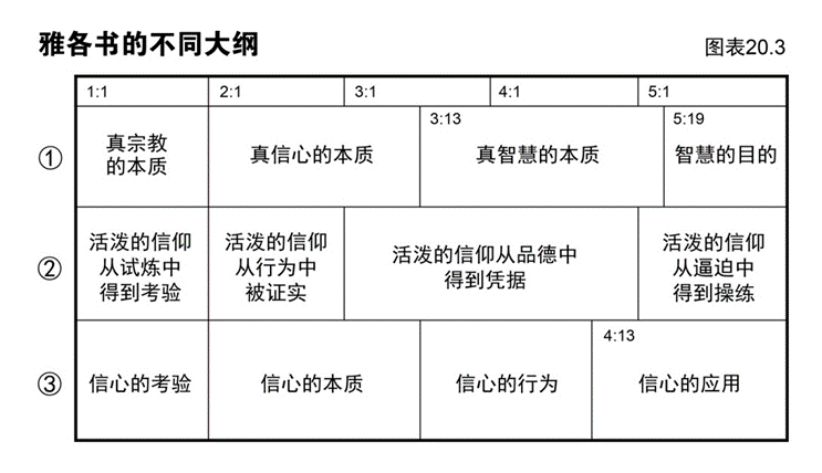 在图表20.3,有三个由不同作者写出的大纲,这是用不同方法概括雅各书结构的例子。[15]试将它们与图表20.4的大纲做一比较。