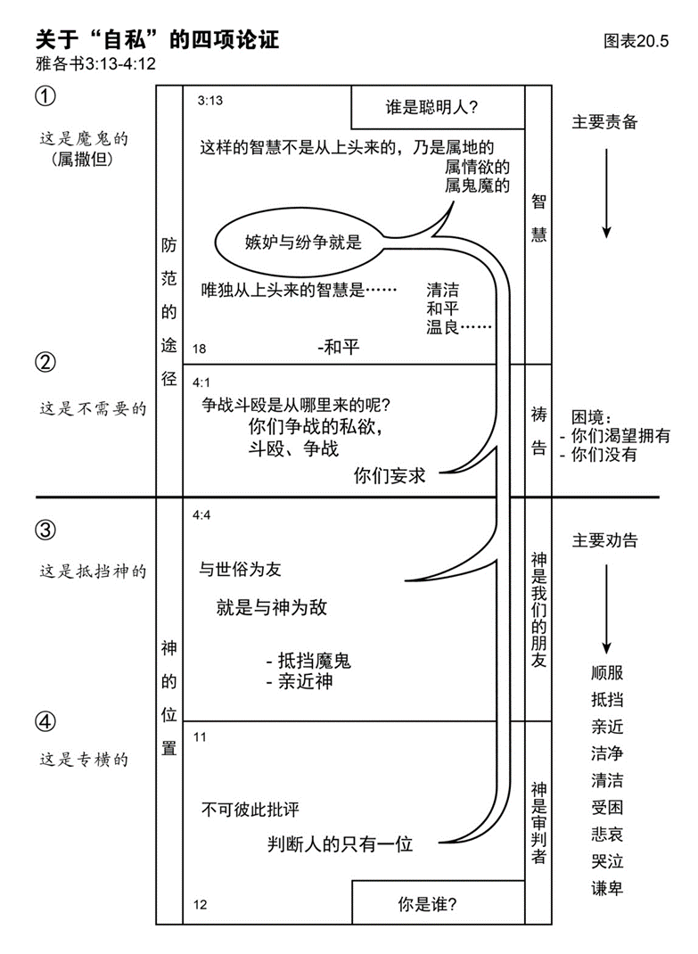 雅各对于这个损害基督徒群体的问题,下了不少笔墨。读这一段时,请参图表20.5,[19]看看雅各处理这个问题的不同方法。他提出哪四项对自私的论证?