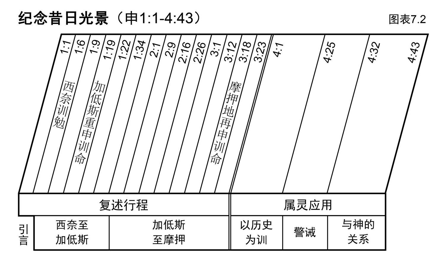 ③ 读1章1节至4章43节,将语调强硬的字眼写下来。在1至3章中,摩西提醒百姓什么?(注意书中常出现“就”、“此后”、“以后”〔Then〕等字。)这三章的内容与摩西在4章1-43节所说的话,有何关系?请从第四章找出摩西用过的命令式句子。(如:“你们要听从”,4:1;“你们要谨守”,4:6)图表7.1怎样描写1至4章?不妨利用图表7.2分段细读。