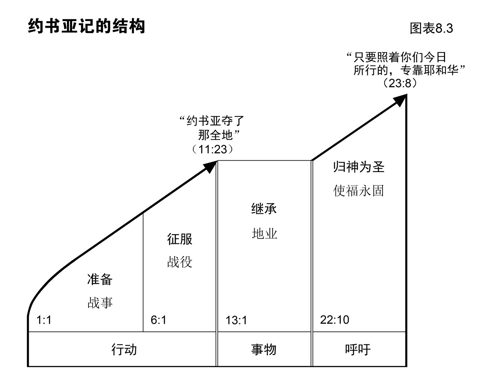 ⑧ 照图表8.3提示,约书亚记可以按逻辑次序分成四大段。前两段为行动部分,接着就是攻取应许之地,钥节是“约书亚……夺了那全地”(11:23)。从征服后起,书中就平铺直叙地记述约书亚分地给众支派为业。再接下来就是对百姓恳切的劝勉,要他们遵守神的吩咐,让神的赐福不断临到安息之地。