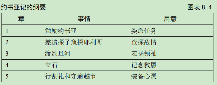 约书亚记前5章记载以色列人与敌人对阵前的情况、准备和布置。请按照图表8.4的纲要读这五章。