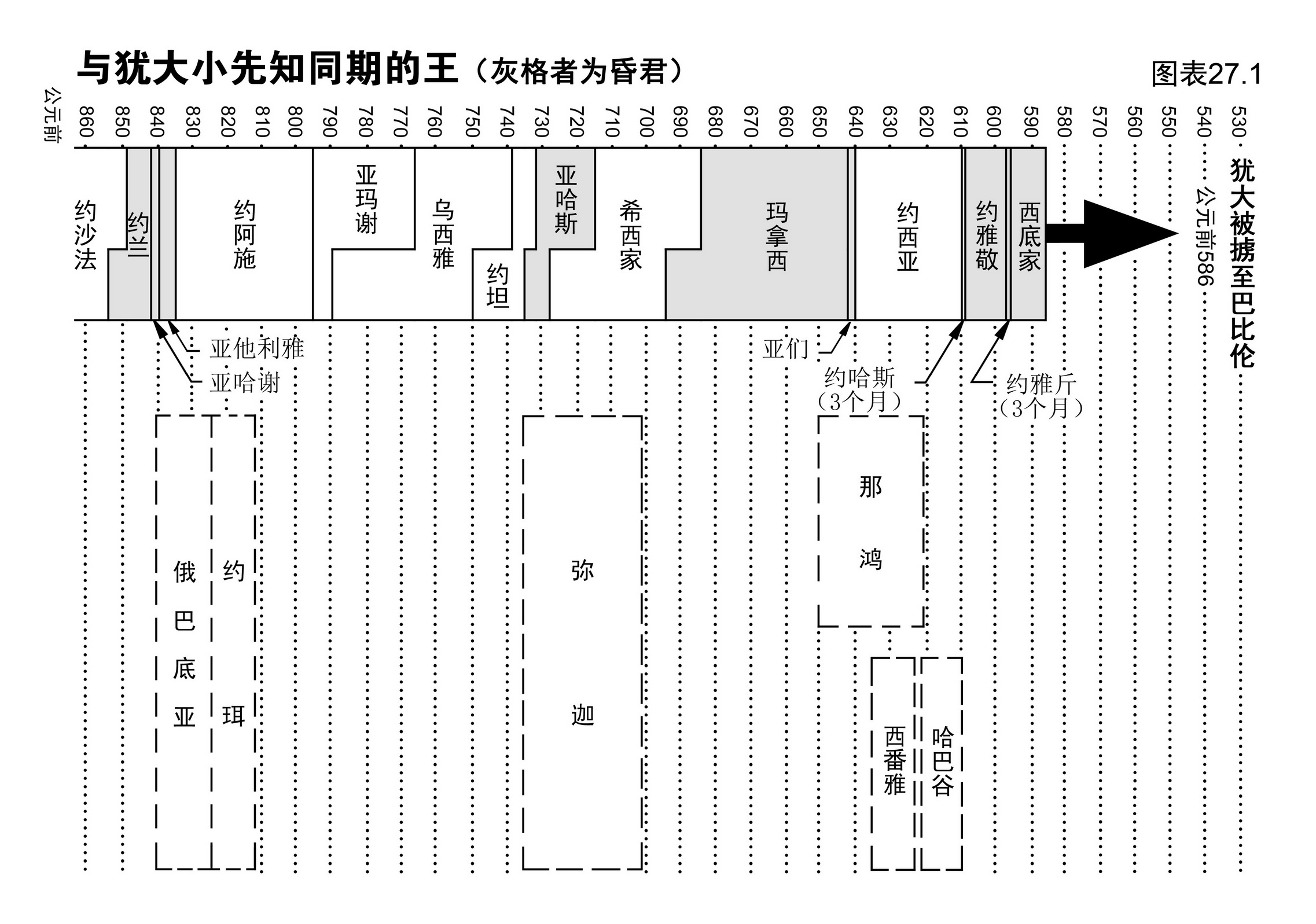 第一节 引言 在犹大被掳至巴比伦以前,十二位小先知中,有六位在南国侍奉(参图表25.1)。本章就是根据先知们工作的先后而定下综览他们那六卷书的次序。图表27.1说明了六位先知所在之世犹大执政的君主是谁